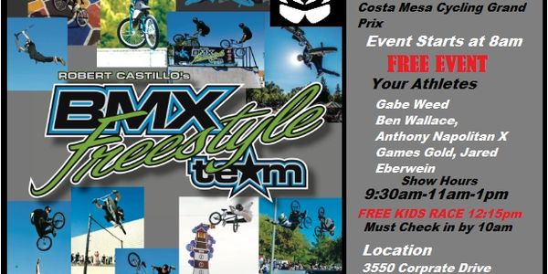 Costa Mesa Grand Prix & Masters Crit Championships. Come join us for a full day of racing and fun activities for the kids with Free demo from Free Style BMX Free kids bike race and our health and wellness expo along with Food trucks for your enjoyment. From 8am-4pm 3555 Harbor Gateway